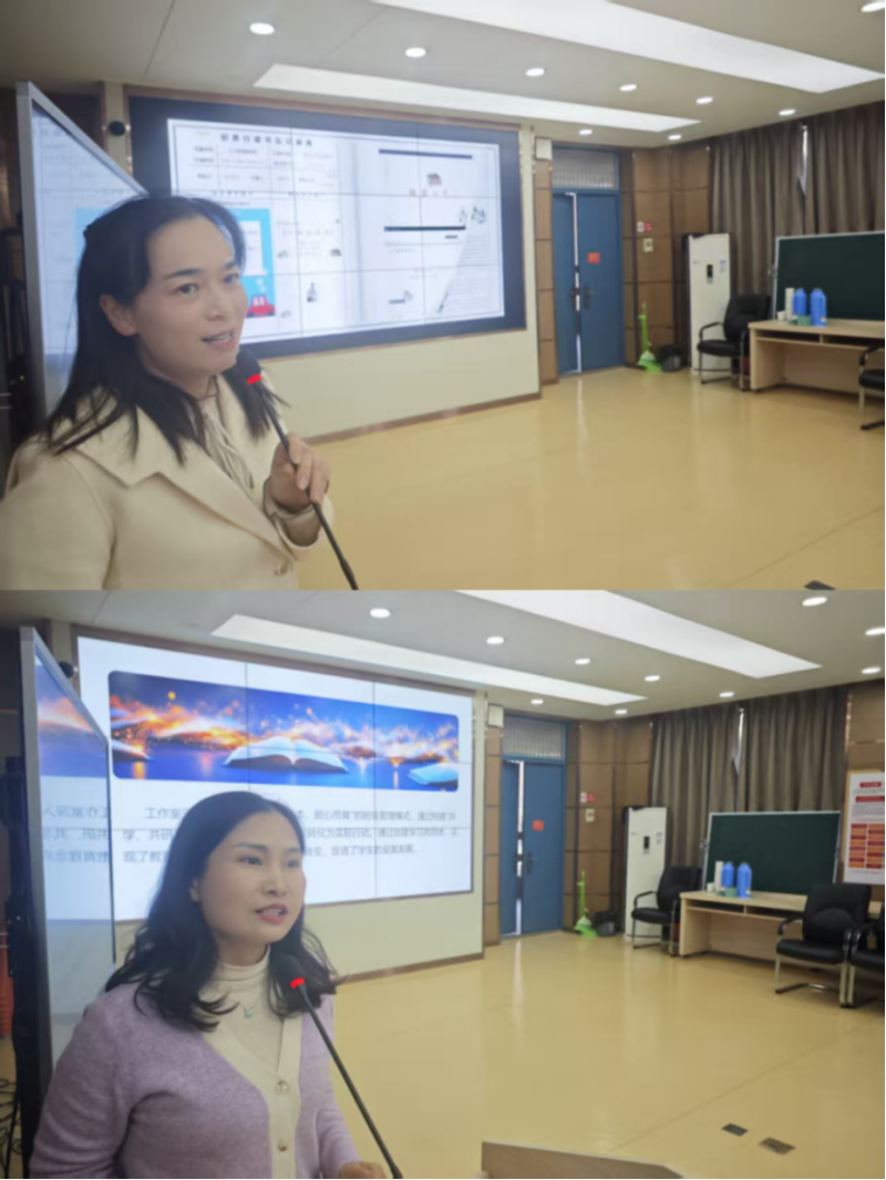 在阅读活动汇报环节,张艳老师系统分享了其工作室的读书方案计划、阅读经验及获奖成果,展现了工作室在专业阅读与实践研究中取得的丰硕成果。朱丽丽老师则详细介绍了其工作室“以生为本、顺心而育”的班级管理模式,通过真实案例分享了如何基于学生心理发展规律实施个性化引导,营造积极健康的班级氛围。