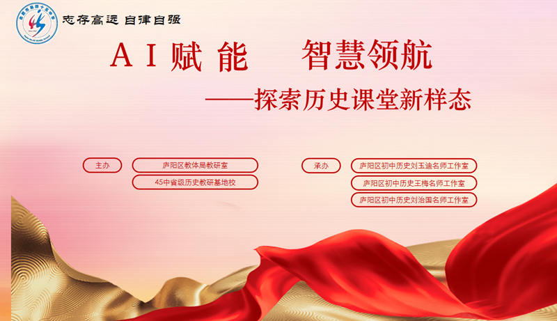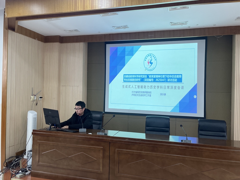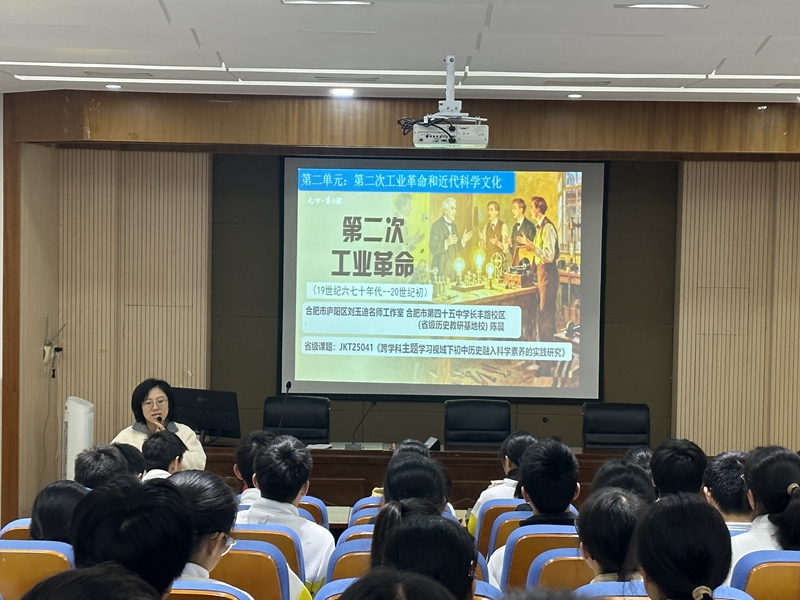 为深入推进初中历史课堂教学改革,探索人工智能技术与历史学科教学的深度融合,分享交流新课标、新教材背景下的教学实践成果,充分发挥名师工作室的示范、引领与辐射作用,2025年12月19日上午,庐阳区刘玉迪、王梅、刘治国历史名师工作室于合肥市第四十五中学森林城分校二楼报告厅,举办了“AI赋能,智慧领航——探索历史课堂新样态”主题研讨活动。