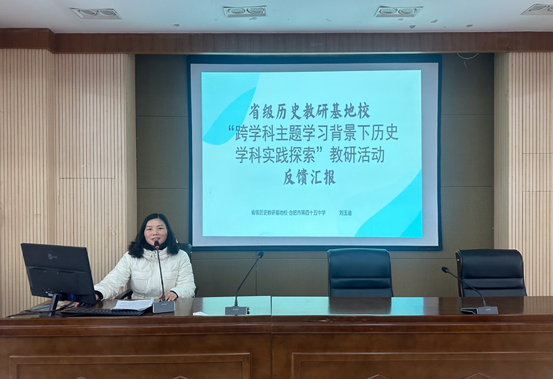 最后,庐阳区历史教研员刘玉迪老师对合肥市第四十五中学·省级历史教研基地校参加2025年12月11日至12日在安徽省休宁海阳中学举办的教育部安徽省历史教研基地“行知·教学研究研讨会”第四次活动暨省历史学科教研基地校2025年度展示研讨活动进行了汇报反馈。刘老师介绍省级会议围绕“跨学科主题学习与历史学科实践”展开,呈现出“理论有深度、实践有温度、案例有力度”的鲜明特点:优质课例与实践成果展示,彰显学科实践魅力;基地校经验分享,拓宽实践探索路径;专家专题讲座,筑牢理论认知根基。最后,刘老师鼓励全区各校积极申报省级历史教研基地校,借助省级平台获得更多成长的机遇;鼓励历史教师持续探索信息技术、人工智能与历史教学的深度融合,深入挖掘学科育人价值,让历史课堂在科技赋能下更加生动、深刻、高效,切实培养学生的历史思维与文化自信。