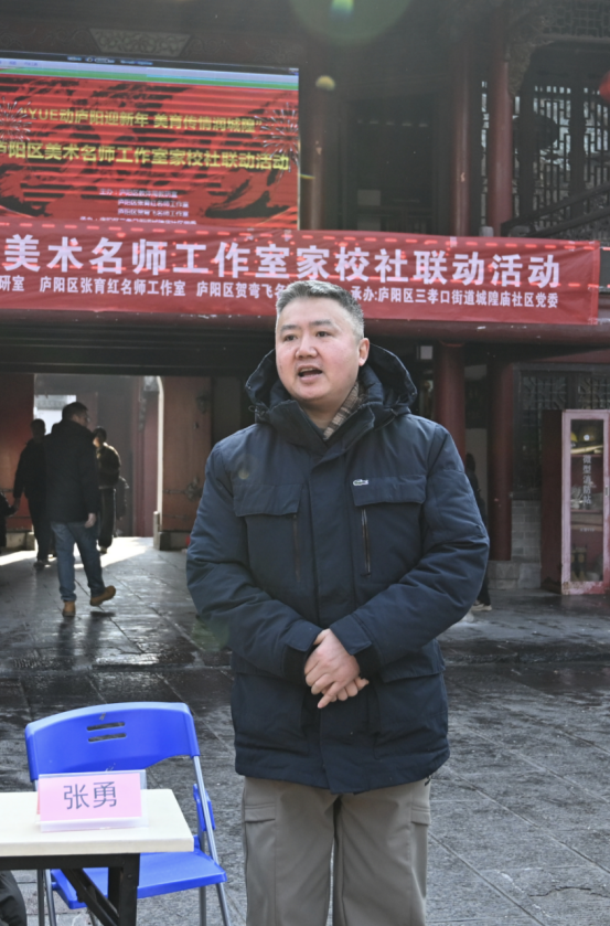 随后,城隍庙社区党委书记、居委会主任胡红率先致辞,对本次家校社联动美育活动给予高度评价,向为活动筹备付出努力的各方表示诚挚感谢。她表示,社区作为文化传播的重要阵地,将持续为美育活动搭建平台,让传统文化在社区落地生根、焕发活力。紧接着,庐阳区小学美术名师工作室领衔人贺弯飞老师分享了工作室以“家校社联动”为纽带,推动美育走出课堂、融入生活的实践理念,展现了美育从校园到社区的生长力量。最后,庐阳区美术教研员张勇老师从专业视角为活动作工作指导,为区域美育发展及家校社联动实践提供了宝贵方向。