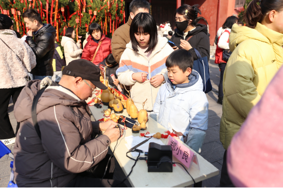 随着开幕式的圆满结束,体验环节正式拉开帷幕。各体验摊位前热闹非凡,参与展示学校的美术教师和同学们全程悉心指导,带领家庭沉浸式感受传统技艺的温度与力量。合肥市第四十五中学的版画摊位前,家长和孩子们排起长队,细心观察、用心按压,将蕴含传统意蕴的福字一一印制于纸上;合肥市第四十五中学菱湖分校的摊位上,同学们挥毫泼墨,一幅幅承载美好祝福的春联跃然纸上,传递着浓浓的年味儿;合肥市第四十二中学中铁国际城校区的剪纸摊位前,一张张普通的红纸在孩子们手中灵巧翻飞,化作寓意吉祥的窗花,老师们的耐心指导让大家兴致盎然。此外,吹糖人摊位前,非遗传承人康夫利现场演示糖料加热、吹塑造型的完整流程,孩子们在家长的协助下,亲手制作出形态各异的糖人作品,童趣十足;郑小良老师的葫芦烙画体验区,参与者手握烙笔,在光滑的葫芦表面勾勒线条、描绘图案,创作出独一无二的新年专属纪念品。整个活动现场欢声笑语不断,家长与孩子们在动手实践中增进了情感,更在潜移默化中加深了对中华优秀传统文化的理解与热爱。