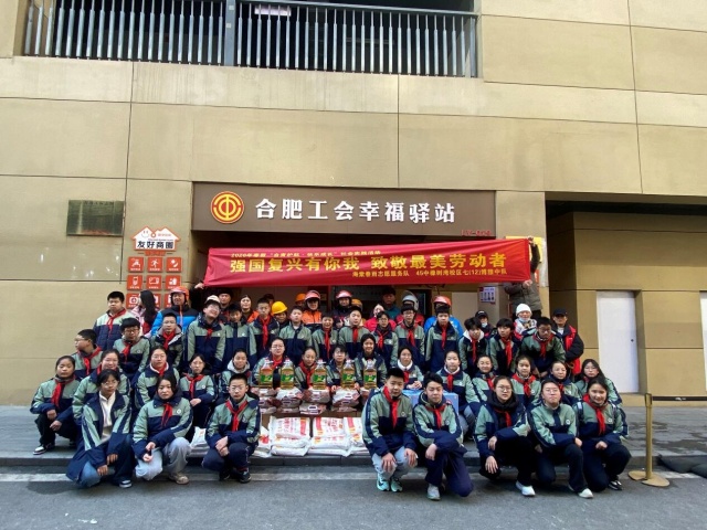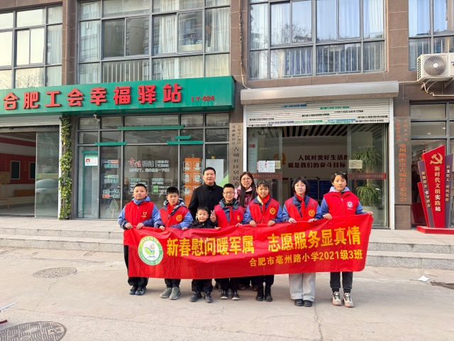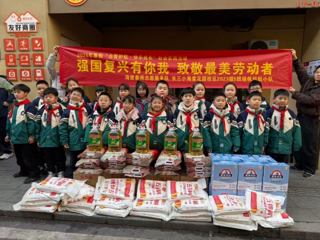 2026年2月11日上午,该校七(12)中队"博雅小队"联合"海棠春雨志愿服务队",走进合肥工会幸福驿站,开展"合育护航·快乐成长"社会实践活动。队员们身着统一志愿者服装,通过"送温暖"与"环境整治"双线行动,践行新时代青少年的社会责任。活动中,队员们向户外劳动者送上大米、粮油等慰问物资,传递冬日温情;同步对周边非机动车停放区进行规范整理,以"小手拉大手"助力城市文明建设。此次活动是"致敬劳动者"的生动课堂,展现了新时代中学生服务社会的责任意识,为构建"友好商圈"注入蓬勃青春力量。