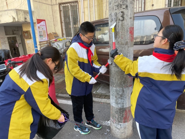 2月13日上午,该校七(10)班的志愿者们走进亳州路街道南河湾社区杏建小区,开展 “少年志愿行,文明护家园” 主题志愿服务。活动中,小志愿者们热情高涨、分工协作,手持工具铲除楼道及墙面小广告,认真捡拾道路和绿化带内的垃圾杂物。大家不怕脏、不怕累,仔细清理卫生死角,用实际行动美化社区环境。此次活动将志愿服务与实践育人相结合,让学生们在劳动中增强环保意识与社会责任感,充分展现了四十五中学子乐于奉献、勇于担的的精神风貌,以实际行动争做新时代好少年。