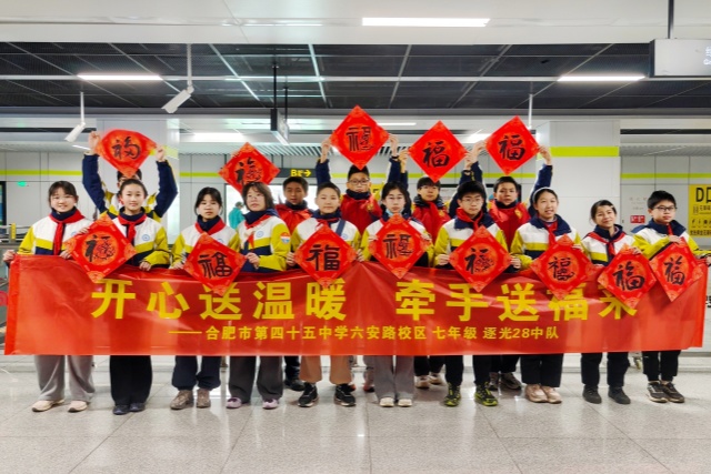 2026年2月9日,合肥市第四十五中学七(28)中队志愿者与双岗街道白水坝社区携手开展暖心志愿服务。活动中小志愿者们协助引导客流、配合安检,并为乘客送上亲手书写的“福”字与新春祝福。他们热情有礼、真诚耐心,用行动传递温暖。此次活动不仅让同学们真切体会到一线工作者的辛劳与坚守,更以少年之力传递爱心、温暖城市。他们用行动诠释了公益的初心:微光聚暖,以爱守护人间美好。