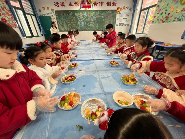 2月27日,该校二(4)中队开展“喜闹元宵 传承非遗”主题实践活动。队员们身着汉服、马面裙等节日盛装,在非遗剪纸环节巧手剪出“福”字和窗花,感受指尖上的千年技艺。灯谜墙前,大家竞相猜解字谜、成语,在趣味中体会汉字魅力。最热闹的要数美食制作——孩子们亲手串水果、裹糖浆,制作晶莹剔透的冰糖葫芦;搓元宵时,藏在馅里的“幸运硬币”更带来阵阵惊喜。本次活动将猜灯谜、剪纸、搓元宵等传统技艺融入实践,让队员们在动手体验中感悟文化内涵,在欢声笑语中迎接元宵佳节。