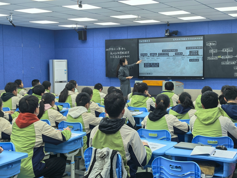 随后,窦梦圆老师执教了九年级复习研讨课《早期现代化的初步探索和民族危机加剧》。窦老师以时间轴为经、以核心事件为纬,通过“时空梳史”“图说历史”“人物话史”等多元板块,层层推进,引导学生深度整合八上近代史关键内容,展现了扎实的教学功底与新颖的复习课架构。